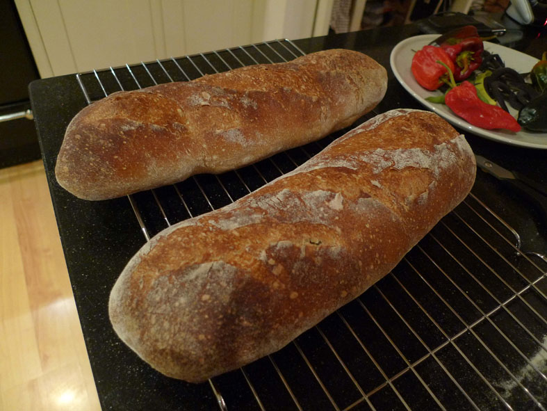 I decided to have a go at a sourdough version of Katie's stout & linseed loaf - waiting for the barm to ripen, I wondered what to do with the rest of the beer and decided "sort of baguette but a bit bigger!"