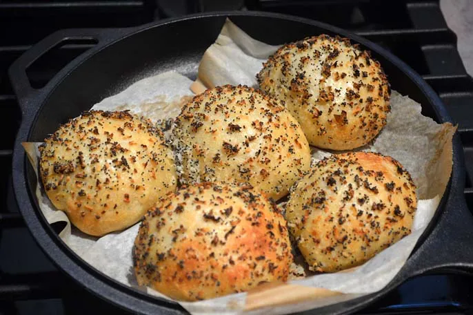 This bake was based loosely on Norm's onion buns recipe and hey, the way the buns lined up in the Lodge cast cooker looked somewhat like the Olympic logo. I soaked 2 Tbs dehydrated onion and 1 tsp dehydrated garlic in boiled water until reconstituted, then used the resulting water for the mix and the onion and garlic for topping mixing salt and oil as per nbicomputers - I think. I used about 20% white levain, forgot to add the egg, but used lots of malt syrup and sugar . . .