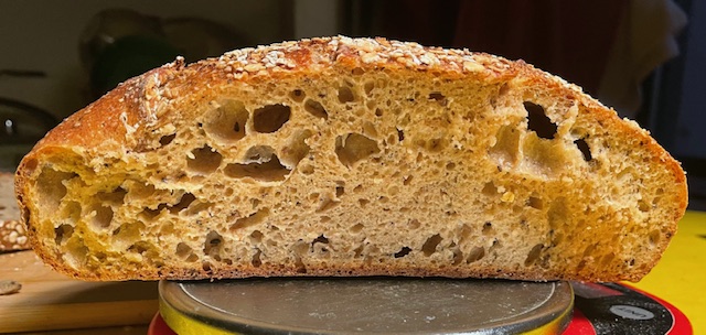 So I was super-patient with the yeast water -- letting four organic apricots sit in water for six days till the liquid was bubbling. But I was super-impatient with the dough: a somewhat more wholegrain version of Hamelman's Swiss Farmhouse formula. (I changed the recipe to 70% bread flour/10% rye/10% spelt/10% malted khorosan because I figured that no self-respecting Swiss farmhouse baker would make a 90% white flour loaf. A white bread is a city bread.)