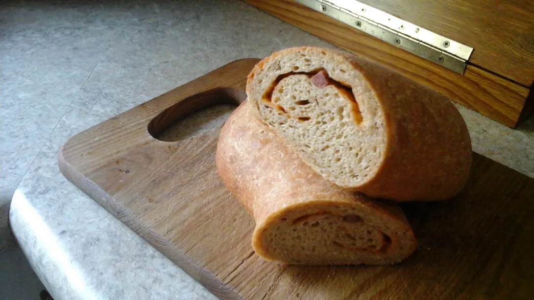 Decided to experiment with some summer sausage and cheese. The dough was made with a combo of fresh ground high extraction Red Fife, home ground corn meal, and AP. The leaven build was started at 5:30 AM with 30g starter, 50g Red Fife, 50g AP, and 70g water. At the same time started the autolyse with 114g Red Fife, 36g corn meal,100g AP and 170g water. The leaven moved fast because it is about 80F in the house and was ready after about 2 hr since I wanted to catch it still on the rise and very active.