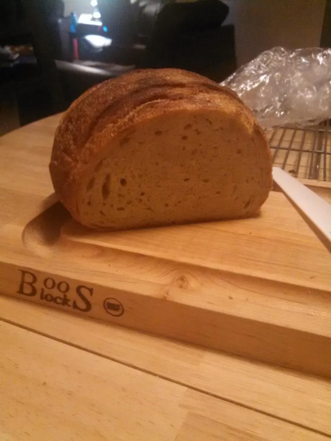 I based this loaf on the Semolina from Tartine. Very pleased with this one. I incorporated a bench rest period, which I think may have helped my shaping issue from last week. The crumb is so nice and chewy and a little sweet and nutty. The crust is a little thinner and lighter than in previous loaves which I like, and I attribute to using parchment in the dutch oven instead of oil. I'm currently enjoying it as a triple decker sandwich with butter lettuce, guacamole, smoked turkey, and bacon.