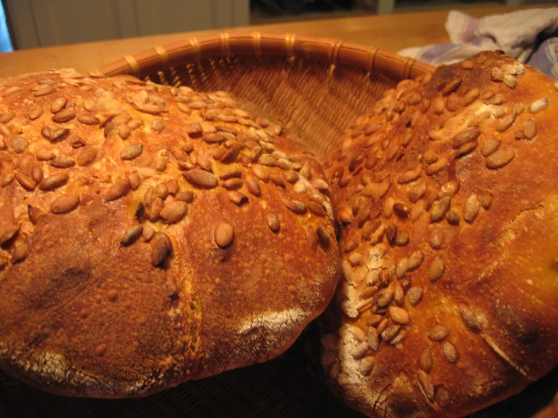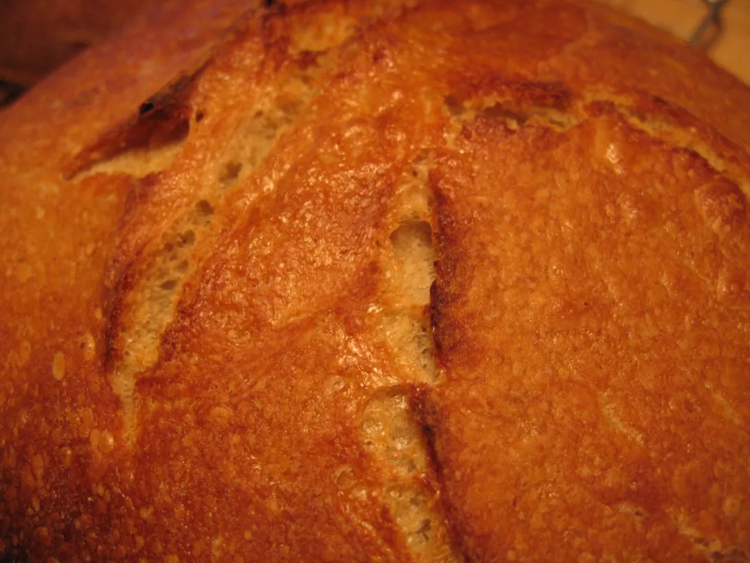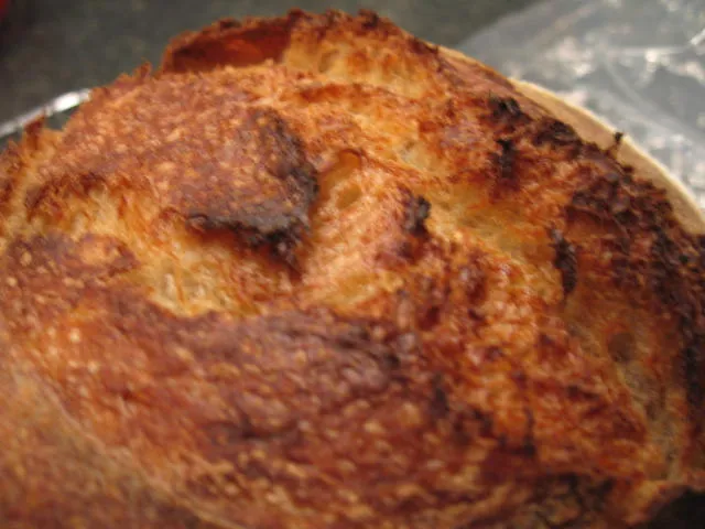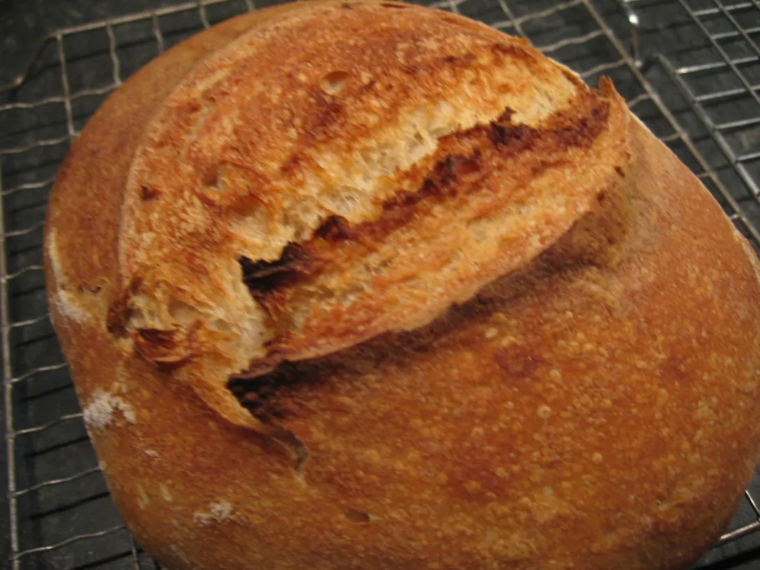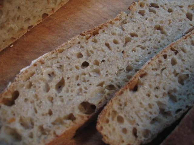 Latest attempt at a spelt bread was more what I was after. I still let it proof for one hour before retarding. Since reading Josh's post after I had made this I will move the shaped loaves into the fridge posthaste and not give them any bench time and see what happens. As you can see this has a lovely open crumb and I even got ears :) I attribute this to gentle handling. I incorporated John's sealing during shaping and then proofing the shaped loaf with the sealed side down and then scoring over the sealed area. Pictures show the result.