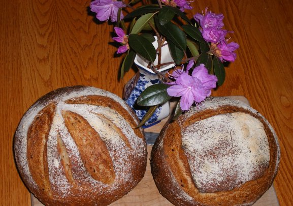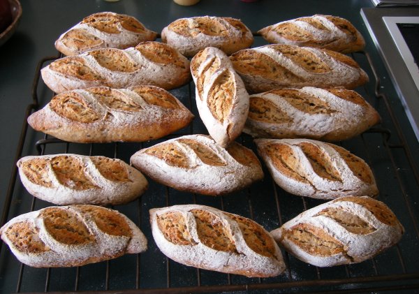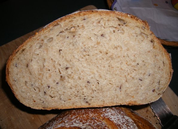 To give my old KitchenAid a break I normally prepare two smaller batches of dough in a row, instead of one large batch. Unfortunately I forgot to account for the flour of the sourdough starter and adjust the flour of the first batch accordingly. No problem lets adjust the water with the second batch. What a stupid idea!! But with the slap and fold method of Bertinet (http://www.gourmet.com/magazine/video/2008/03/bertinet_sweetdough) I was able to get myself out of trouble and the result was pretty good.
