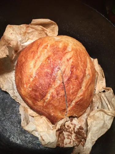 I thought that the dough was at the 1.75-ish cup point, thus I heated the forge, put it in wet parchment. Took out the heated cast iron, placed it in, poured in a half a cup of water under the parchment and started the usual 450 after 500 for 20 then for 30. Herein is the result, small, unimpressive, with no 'boom' really.