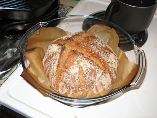 [i]^ Whole wheat sourdough ready for their overnight retard. Obama lurks in the background, waiting. Some 14 hours later, the boule pops out of the oven.[/i]