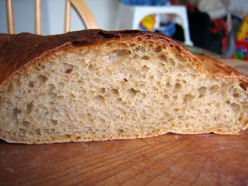 The good news: the slack dough made wonderful bread. Even with a quarter of the flour whole wheat, it was light and airy. We gobbled it up.