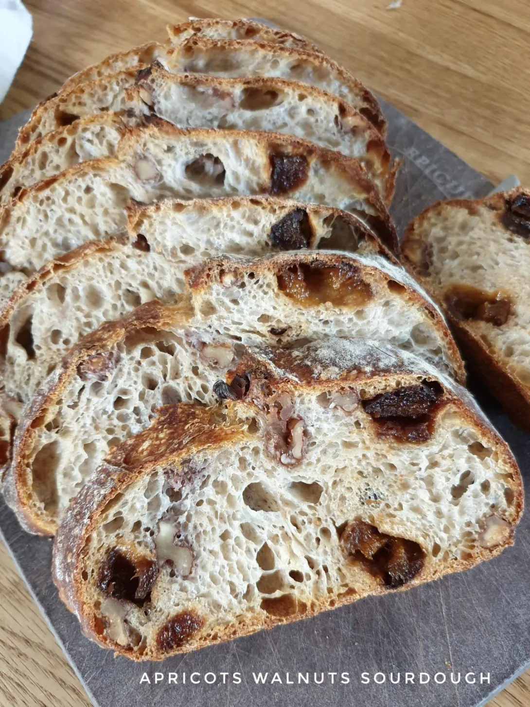 This is a standard bakers percentage recipe. I did folds in intervals of 30 to 40mins, depending on what the dough told me. Apricots and walnuts were added during lamination.