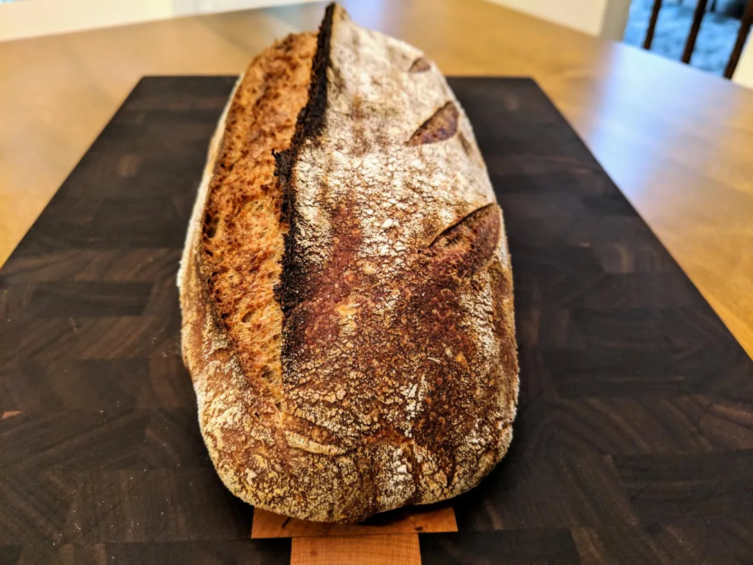 This one is a big boy. It went into the oven at 1,871 g and came out at 1,675 g losing 10.5% of its water weight as it baked. It turned out with the 3 B’s but we won’t cut into it till Thursday or Friday to see if it is OSM. We baked it to 208 F, 20 minutes under Mega Lava Steam at 450 F and 36 minutes at 425 F convection.