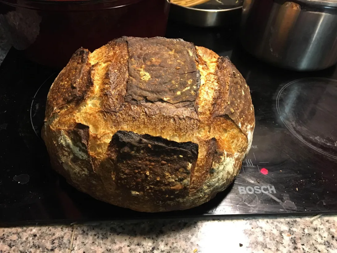 I regret I hadn't photo documented and tasted that yam loaf. It took much longer rising (influenced by long rises on the Tartine theme) ending up on the porch overnight, and because that was too cold in the morning, I did some microwave low voltage zaps to it and then when it got to rising, had to tip it out of the banneton (no problem, rice flour) and fold the dough. It was so full of rice flour (fear it might stick) I ended up holding it under the running tap to wash off the flour. A few folds in the air with wet hands and I was in business.