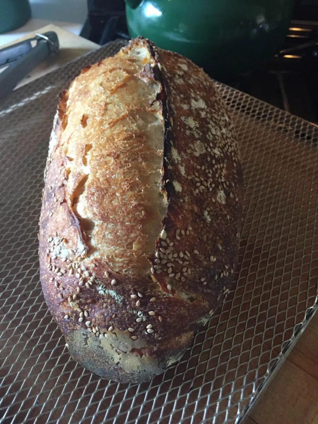 A really crazy, busy week. I fed the starter, but did not get round to making the dough until the next evening. There was no time to make the loaf, so the dough sat in the fridge for another night and day. The next evening I took it out, briefly kneaded it and formed a loaf. Back in the fridge overnight. She did not look impressive by the next morning. I was in a rush and left the oven on too high a temperature. She burst out of her skin, and rewarded my neglect with a really tasty loaf with a great crumb. Thank you sourdough!