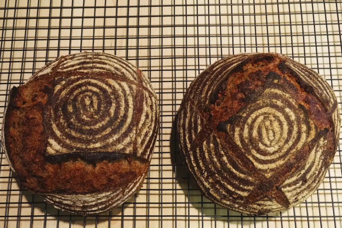 Spelt, honey, and walnuts seem to like each other's company, as demonstrated very happily by this bake. It's true that the scoring leaves a lot to be desired and the loaves could have come out of the oven sooner. Regardless, the crumb was moist and the taste more delicate than the ingredients might suggest, just right for sandwiches in fact.