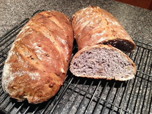 There's a little yeast, a lot of sourdough starter. I used oat, whole wheat and all purpose flours. Added a little honey and a little turbinado sugar. Mixed in some unsalted nuts and seeds (walnuts, almonds, cashews, pumpkin and sunflower seeds, all unsalted). A touch of walnut and sesame oils.