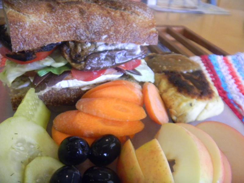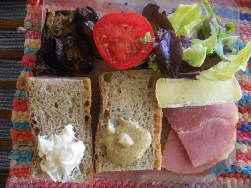 Had some left over grilled Japanese eggplant to go with leftover Holiday Ham, last nights salad, half a tomato, last of the brie cheese, home made Dijon mustard and some mayo.