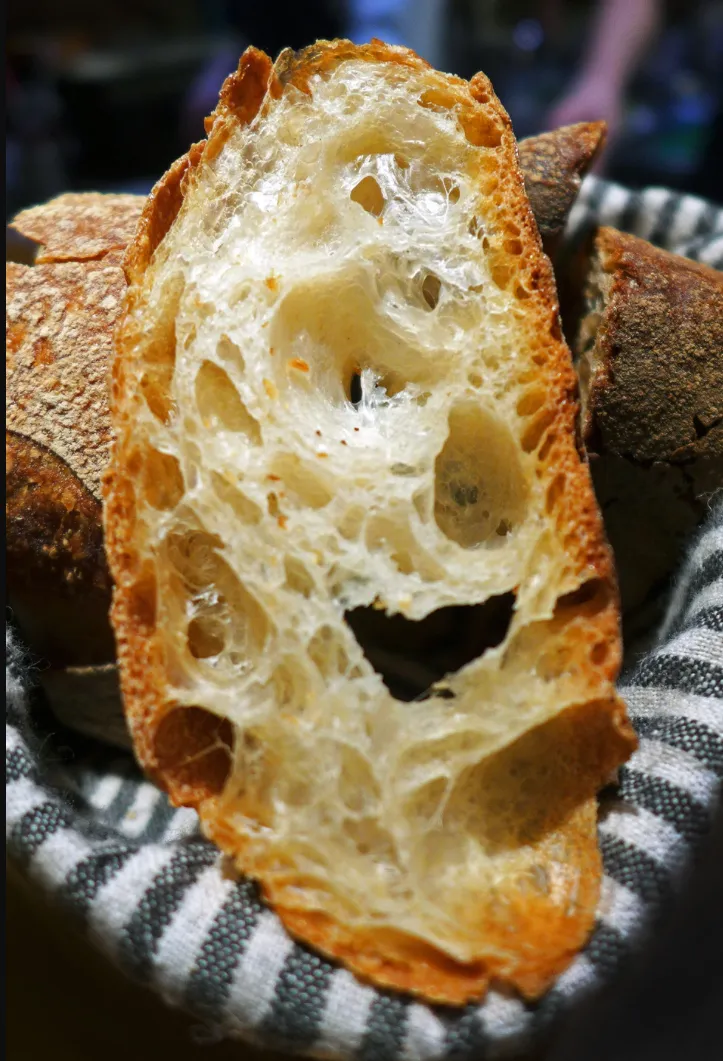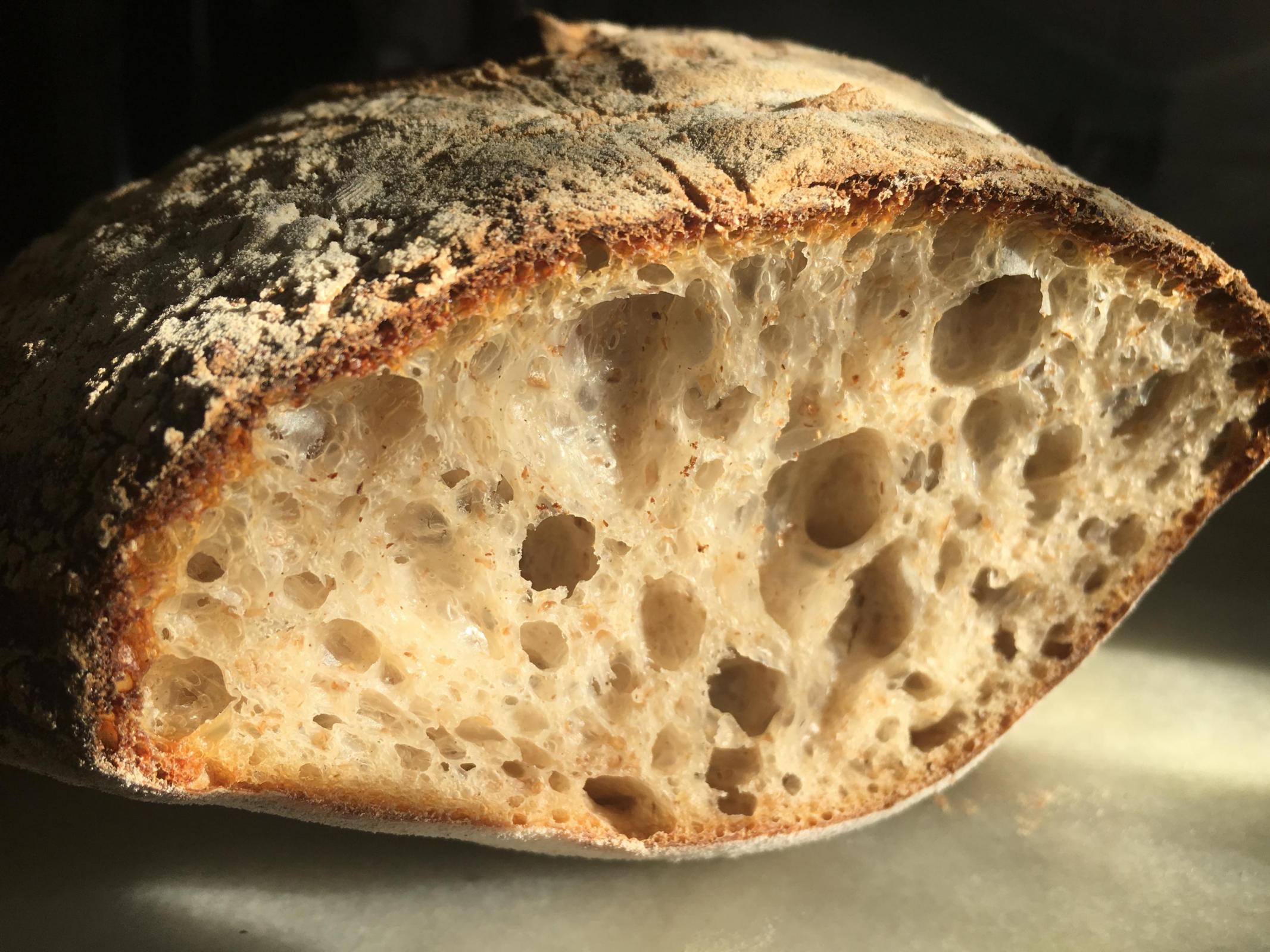 He practices what he preaches and shows how he gets an incredibly open crumb at 65% hydration