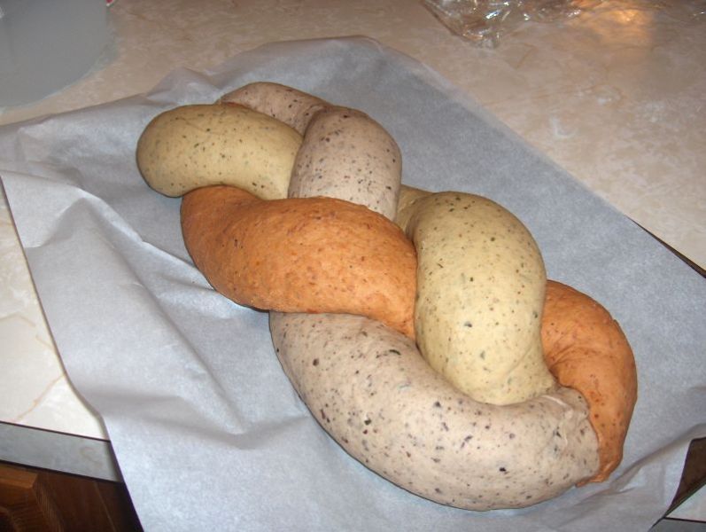 It's essentially three separately flavored bread loaves braided into one big un, the flavors being olive, sun dried tomoato and pesto. The only thing I changed in the recipe was instead of making the three pastes to flavor the bread I bought 8-ounce containers of pre-made from Whole Foods. At $4 a pop it was cheaper in the long run and saved some time on an already hectic morning or party prep. The picture below shows the pre-baked loaf before the final rise: