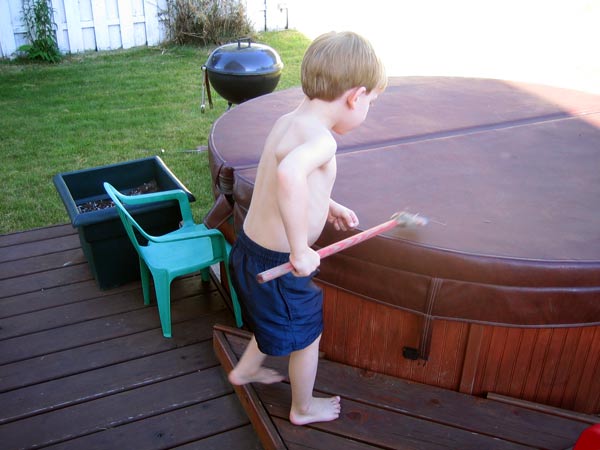 His toy broom, which has hardly a bristle left, has recently been transformed into a peel. A super peel, perhaps?