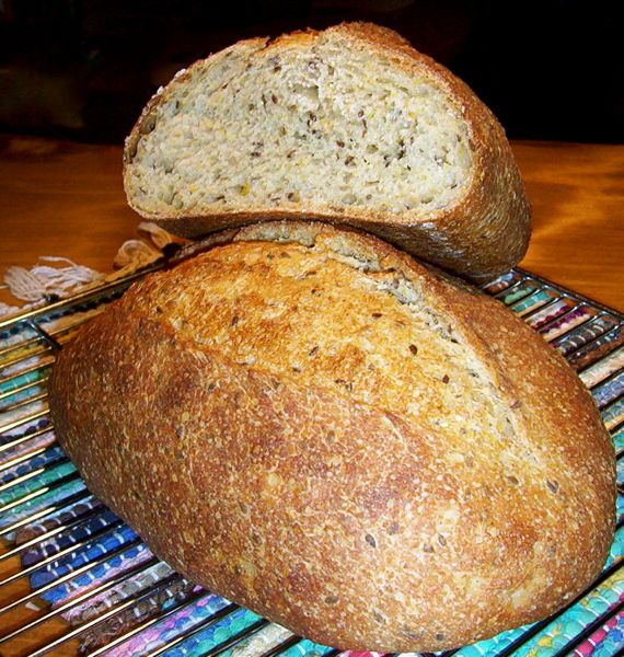 Basically the loaves are Reinhart's basic sourdough in the BBA, but I substituted whole wheat for 6oz of the bread flour, and also a cold overnight soaker with 4oz oatmeal, 3 oz polenta, 1.5oz flaxseed and 12oz water. I bumped up the salt from 0.5oz to 0.7oz.