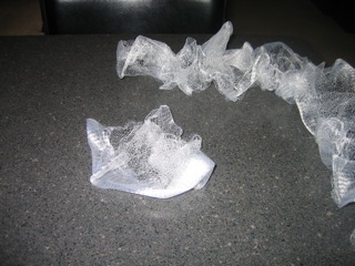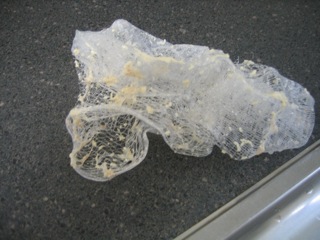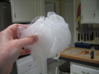 I usually use bags that onions, etc., come in to remove dough from bowls and utensils, but it seems like I never have enough of these bags when I'm baking a lot. Yesterday I bought one of these nylon bath scrubbers at the local market for 89 cents and cut it open at the knot. It yielded a whole big tube of netting perfect for scrubbing off gummy dough and starter.