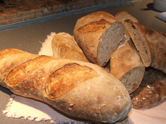 I made two loaves of "Five -Grain seeded sourdough bread" using the recipe on this web site(based on Peter Reinhart's Basic sourdough bread, The Bread baker 's Appreintice). These two breads had the best appearence of all the breads I made on this day. (I used 100% hydration wheat sourdough starter which is mature and sour). The crust seemed very dense and the bread is quite heavy without much" holes". It tasted great and not too sour. I think I probably didn't let it ferment long enough. I used the two days method instead of the three days. I probably used too much steam.( Beside put hot water in the pan, I also used a plant sprayer to spray the oven off and on on the first 10 min. of the baking time.)