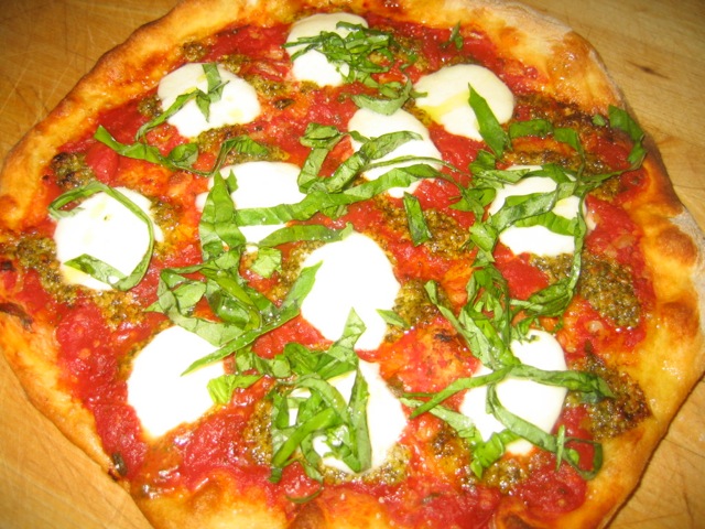 Some nice looking pizzas on this blog! I use Peter's recipe too. I pipe Pesto onto basic red sauce recipe, bake with fresh mozzarella, and garnish with salt, olive oil, and basil.