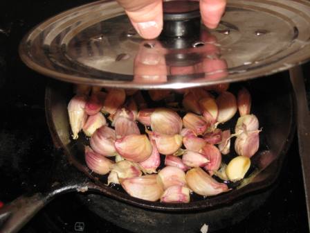 put the unpeeled garlic in the frying pan and cover it. Walk away to enjoy a cool refreshing beverage,