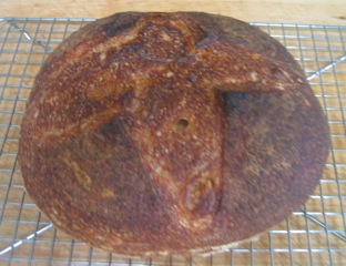 A few days ago, I posted about the success my first sourdough loaf, and the fact that I am now totally hooked. I baked a second loaf today, and I am both ecstatic and disappointed by the results. Ambivalent feelings aside, the bread tasted great, and the crust was that delightfully crunchy-yet-chewy texture I was looking for. The crumb was moist and delicate, but there were no large and irregular holes that I would like to have seen. The flavor was mildly sourdough (as expected), and the oven spring was amazing.