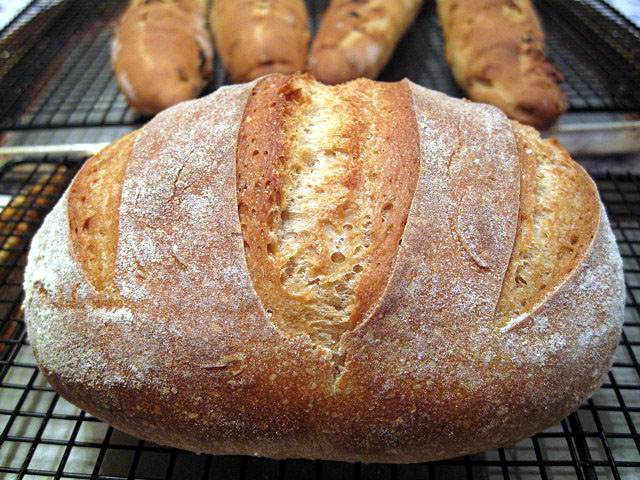 Of greater interest was the final shape of the loaves. They are formed as boules, and I proofed them in round, linen-lined wicker bannetons. I scored them with 3 parellel cuts, as Leader recommends. The loaves took an oblong form even before I could load them in the oven. This is a graphic illustration of the effect of this pattern of scoring on loaf shape, as described by Suas in "Advanced Bread and Pastry" and referenced in my Scoring Tutorial. (See the TFL Handbook.)