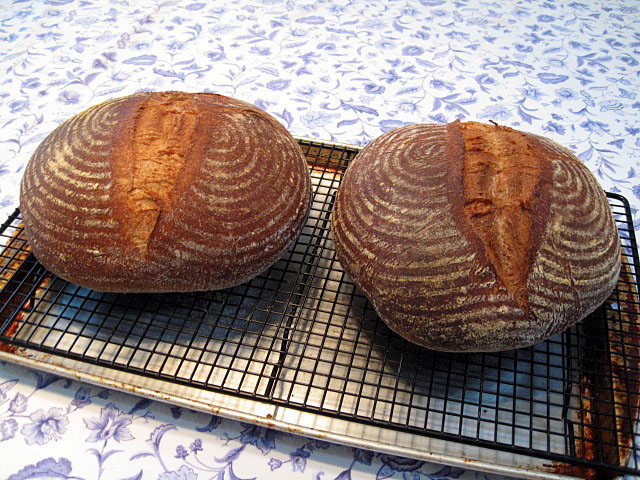 In truth, jembola, Mini has created a mythperception. The loaves were proofed in round brotformen made with coiled wicker. The baskets are floured before putting the boules in them. The purpose of the flour is primarily so the loaves release easily from the baskets, but a side benefit is that it leaves this flour pattern on the surface of the loaf.