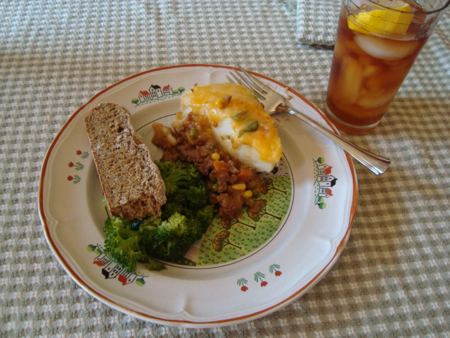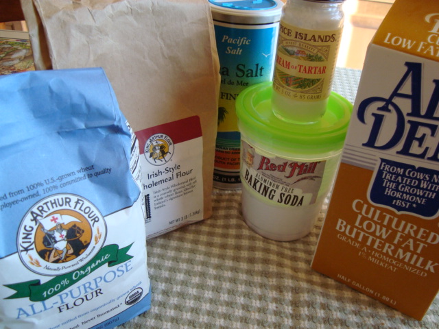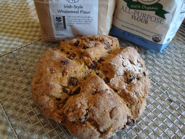My order for K.A. Irish whole meal flour came today.  So I thought I would give it a try using my recipe posted earlier for Sylvia's Irish Soda Bread {I don't know how to do the link} to my blog! ; /  The only thing I did different was use all IWM meal flour and I mixed completely with my 4 straight fingers and pushed it gently into a ball and shaped it.  I was very pleased and my husband also liked it very much...which made me happy!  I also like Bannock very much...which means bread...it's not your traditional soda bread because this one has egg, brown sugar, butter and raisins in it...but it is very good..so I made it useing some AP and IWM before I have always made it useing only AP flour ...my husband told me a few times how much he liked it!  The flavor of the IWM was very pleasing, wholesome and tender...not a chewy texture!  More like eating a bran muffin!! The  Irish brown bread went great with the leftover shepard's pie for a quick dinner!  We are eating Irish all week!!