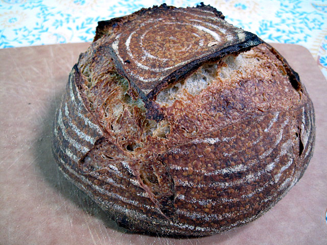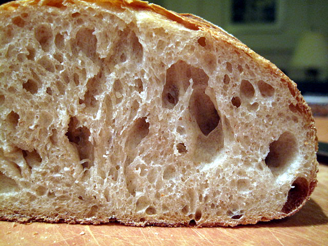 The loaf that I cold retarded overnight is significantly more wonderful than the first one. In fact, it is close enough to my idea of "perfect sourdough bread" that I can't measure the difference. It has a fabulous taste, crunchy crust, chewy crumb. Wow!