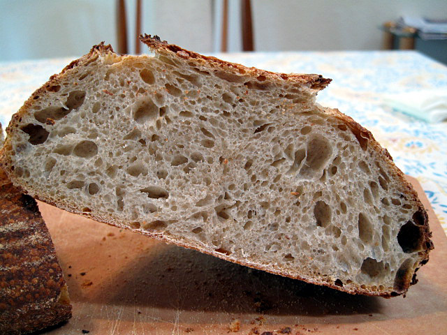 This loaf had a crunchier crust and significantly more sour flavor than the loaf that had not been cold retarded. The crumb was chewy but maybe a bit less than the loaf baked the night before.  To my taste, this loaf was just about perfect - very close to my personal ideal sourdough bread. I bet it's going to be even better the next day.