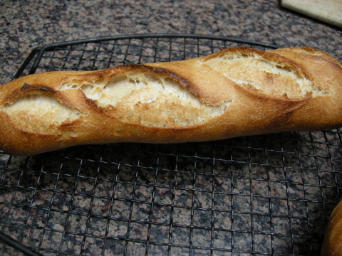 I had a few problems with it - mostly with the shaping, I think - if you look closely at one of my loaves, you will see it has "stretch marks" - from when I tried to do the final shaping, rolling the pre=formed baguette into its longer version. Also, because I wanted to bake them inside an upside down roasting pan, I could not make them as big as they should have been. They turned out ok, but a little on the heavy side