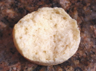 I cut 4 rounds and then stacked the scraps, and rerolled for a 5th. I baked them at 475, per the recipe, but my baker instinct told me that was too hot (they set too soon and didn't rise as high as they should have). And I wasn't satified with the taste, the texture or the color, either. But one thing was illuminating---the 5th biscuit, from the rerolled scraps looked the best, inside and out. So I mixed up a second batch using bleached all-purpose (the first batch was unbleached AP, both Gold Medal flours), in addition to the 6 keading strokes, I also gave the dough 2 turns before rolling out and cutting (one envelope fold in each direction as if laminating). And lastly, I reduced the oven temperature to 425F and used the convection feature (because that's what my oven's manual recommends).
