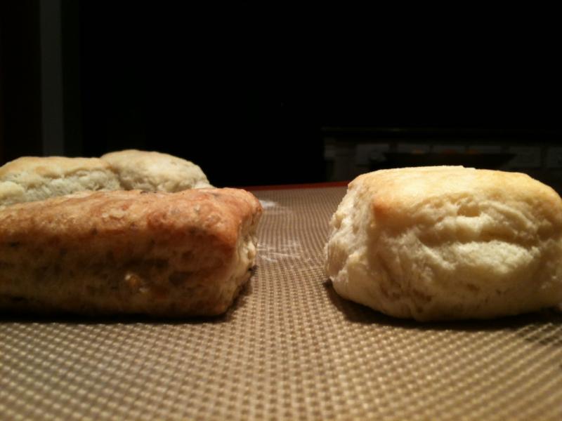 after another 5-6 minutes in the oven i pulled them. The result was a very good biscuit, pretty fluffy and light and in comparison to the weekends attempt much better. Below is a side by side comparison and the interior crumb of the new biscuit.