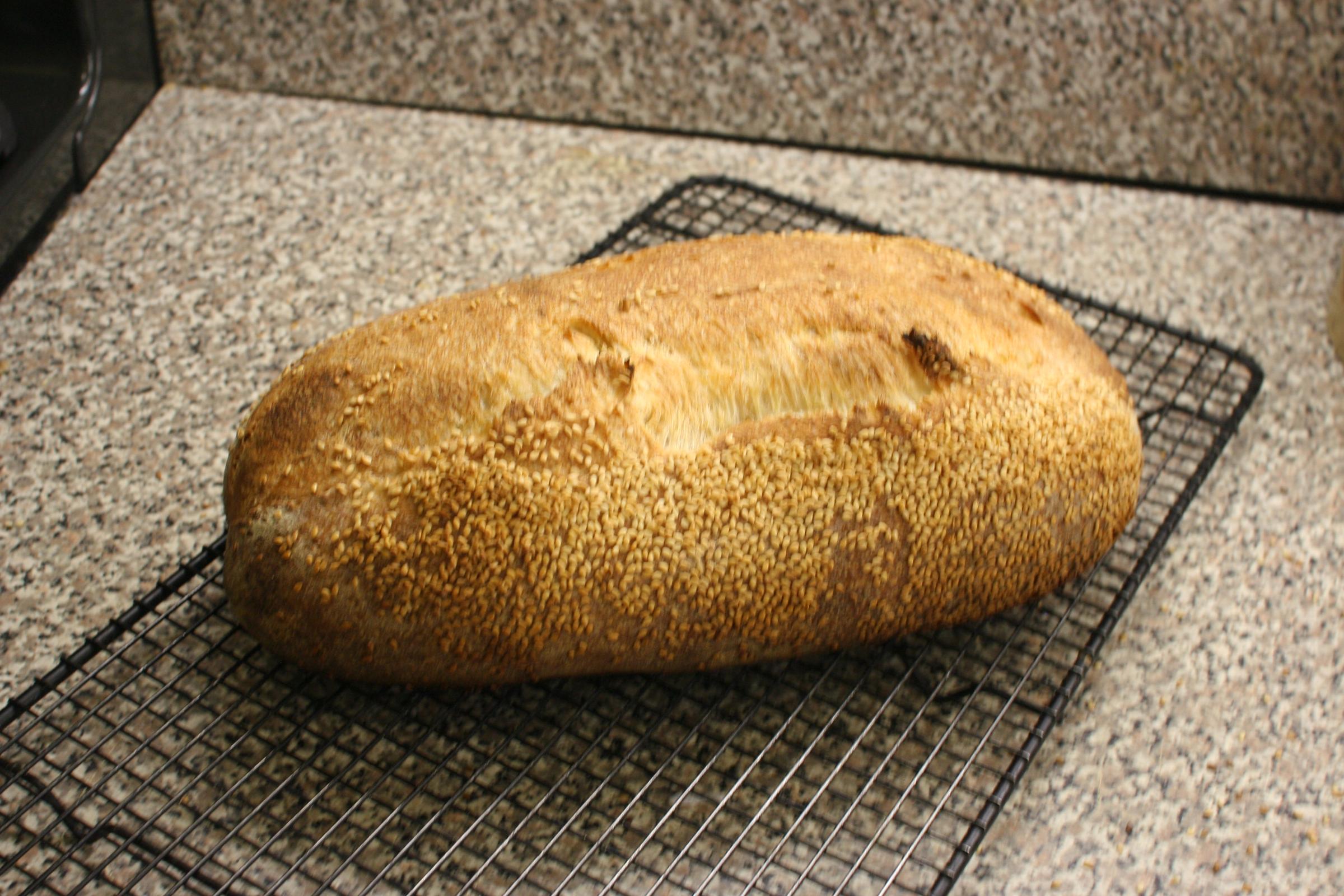 I split the dough into 2, let it rest 20 min, shaped, rolled in sesame seed ( not 2 cups!) and let the second rise go in oil sprayed parchment lined couche shaped double baker covered loosely with a wet tea towel. I preheated the oven [extra time] with a pan full of water for the steam effect and did the first bake 15 min then turned and baked 15, then turned again for 15 min finish. Removed from the oven for cooling.