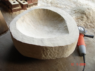 No bark-no bite to this burl! The wood is very hard and there are nice swirls inside the hollowed area. He's had to chisel and chainsaw, practically had bend over backwards to move it around. Then he started sanding and carving and measuring and balancing and deciding where the wood was good and what the best shape would be. Leftovers - there has been more than three wheelbarrows full of sawdust and wood chips.