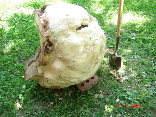 In past writing I've mentioned that I've been looking for a bread bowl. I own an antique kneading bowl that didn't clean up well and was too cracked to use so I have been on the prowl. Well, in the woods here in TN we have a variety of trees and my hubbie and I found a very big burl on a white oak tree on our property. We had the tree taken down (too big for us), got the burl off, and have set about making a bowl. It's an undertaking I tell you. We think the original whole burl and associated bark, etc. was over 120 pounds and about 3x2x2 feet big. My hubbie is doing all this work, he has experience with wood as he has been an amateur carpenter of sorts for the last 30 years. Here is the burl with most of the original excess wood removed, mostly by chainsaw.