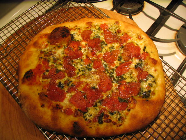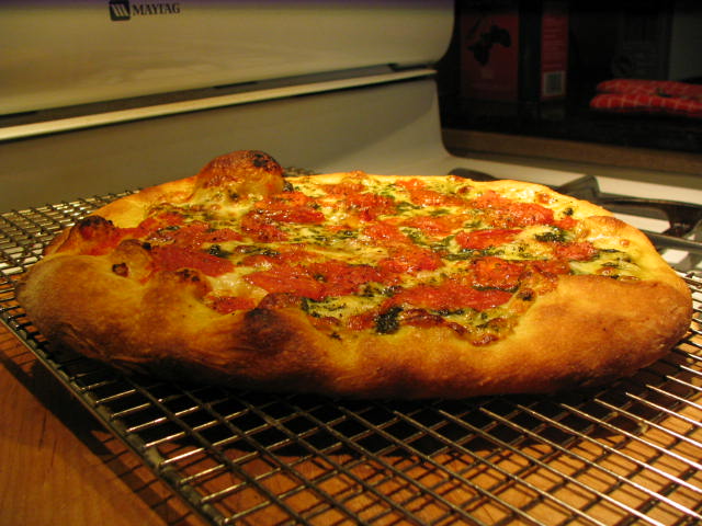 Hmmn, interesting thread here.  I've experimented with using KA's "Italian style" flour (or whatever they call it) in pizzas.  But what I noticed is that my pizzas didn't brown up as nicely as yours did.  I have a gas oven which goes up to 550 degrees Farenheit.  I always thought "00" flour needed the higher temperatures of a wood oven (or jerry-rigged home self-cleaning one) to carmelize well.
