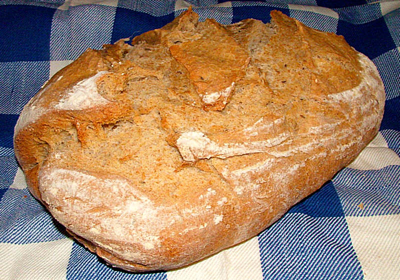 After 24 hours, two-thirds cup rye flour, one cup water, caraway seeds, are added along with a little salt, mixed well, and about three cups AP flour are added slowly.