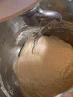 Next, I pour the dry mixture on top, replace attachments with the dough hook, and turn the machine on to level 2 for two minutes. If it doesn't seem to be picking up the flour as well as I like, sometimes I stop the machine, and scrape the bowl with the hook a few times.