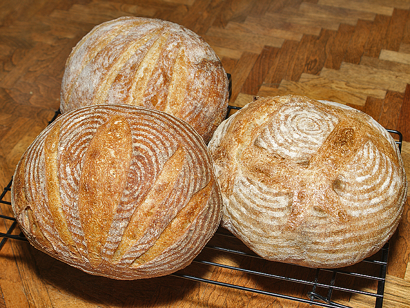 A photo of the two bakings: The loaf in the upper left corner is week one (we ate the second, and bigger loaf). The two front loaves are this week's effort. There are slight differences in appearance--nothing significant--the biggest being the difference in crust color between the two same week loaves. After 10 minutes baking, with steam, at 480°F I turned the oven down to 450°F for the left hand loaf (the smaller one, by weight), and 440°F for the right hand loaf, which had to bake an additional 10 minutes. (I'd done the same the week before, but the crust color was more nearly the same.)