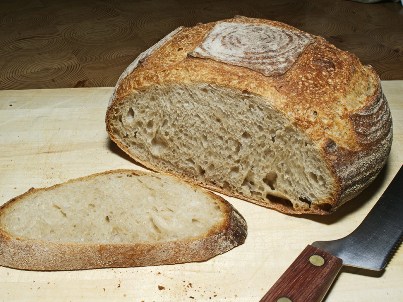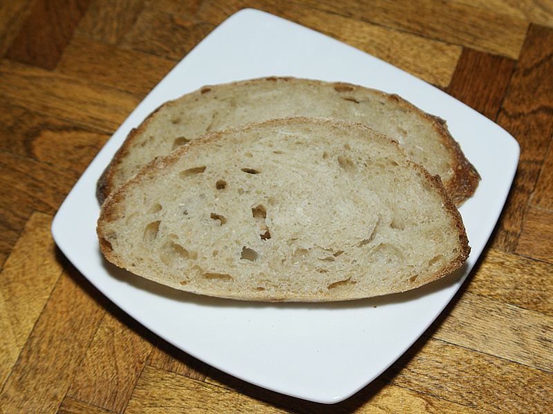 This is the crumb from the first week's loaf. We haven't cut either of this week's loaves, but by the feel of them we expect the same degree of openess. The flavor of the first week's loaves is excellent: good sour from slowly building the starter (30% of the flour weight) over 24 hours, and overnight retarded bulk proofing; the whole wheat flour lends a distinctive base note, surpirsing because it's only 10% of the flour weight; and the high initial heat, and steam, give the crust a delightful toasted nuttiness. The final test will be the taste of the second week's loaves, but we don't expect any significant difference.