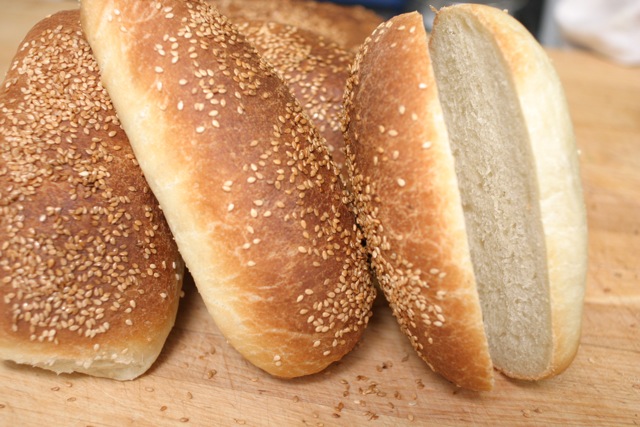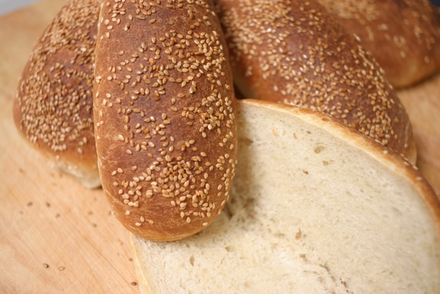 Note to self: whenever putting sesame seeds on the outside of loaves, rolls, etc., brush the target with egg white wash or most of them will be on the floor and not in your mouth. I can't tell you how many times I swept the kitchen floor yesterday! Before bagging the breads, Jim said, "Why don't we just scrape the seeds off!" I agreed whole-heartedly!