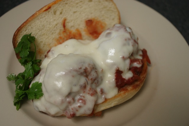 The meal was a winner and the bread held up very well to the meatballs and sauce. I dressed the meatball with a semi-firm whole-milk mozzarella and popped them under the broiler for a few minutes.