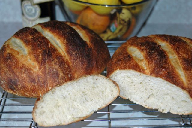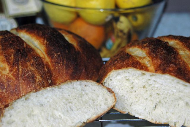 I started my firm starter last night. This morning I prepared the dough. I did my first autolyse ( I didn't have a clue what that was before TFL). The boules shaped up ok this afternoon. I think they over proofed a little because I had some deflation when I scored the loaves. Using steam was something I wanted to do so I preheated the oven with my cast iron skillet inside along with my stone. In went the boule onto the stone followed  by a cup of boiling water into the skillet. I made use of the parchment tip this time (see, I'm not that slow of a learner). I pulled the parchment out after the first 10 minutes. Here's the results of the day.