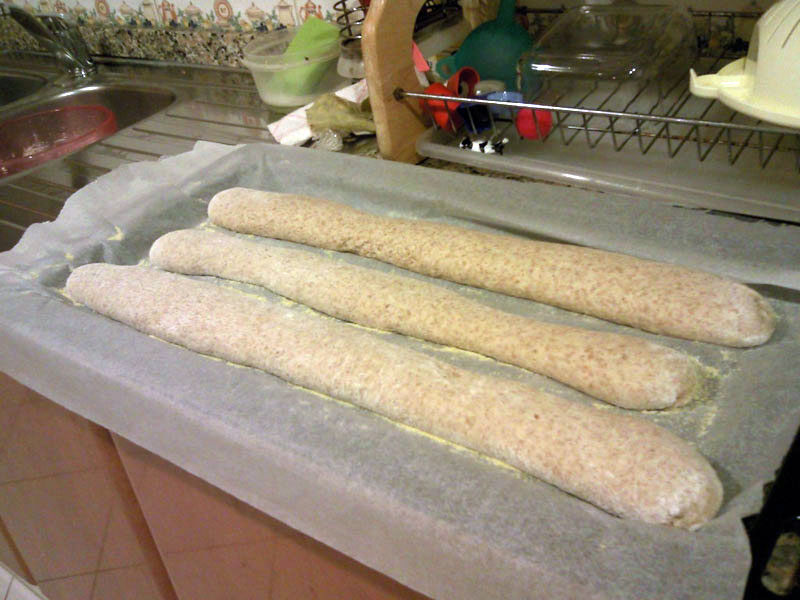 5- after 1st rise, i did not deflate, i just scrapped carefully the dough into some floured workspace, and began gently shaping (by folding ends and forming a roll by sealing seams) and then rolled into a baguette.