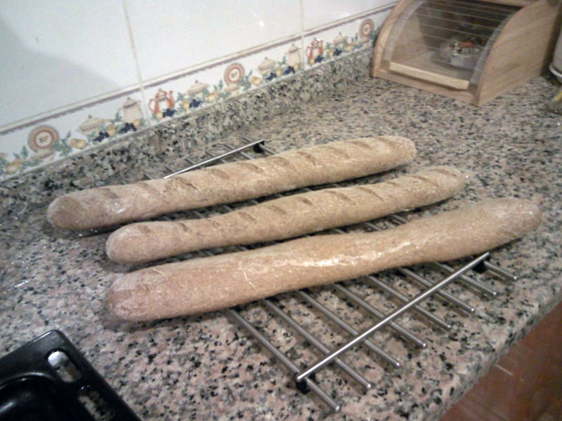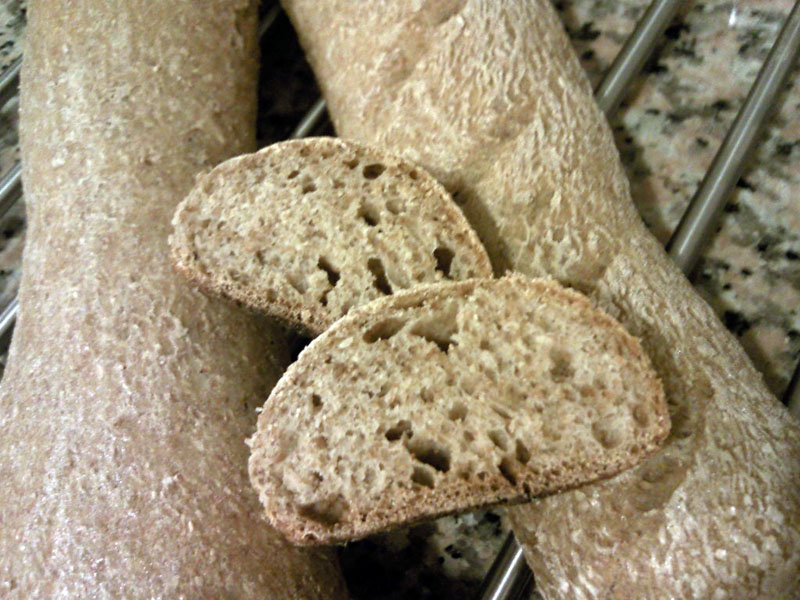 The outcome: Well, I couldn't wait for the bread to cool, so i cut it. It tasted well, and heavenly with butter!!!. The holes resulting from fermentation weren't uniform across the baguette length. But the crust was crunchy and crumb was light (for a whole grain).