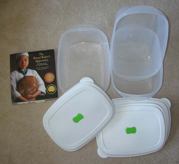 I was getting tired of covering my mixing bowl with plastic wrap to keep the dough from drying out while it fermented. For me, unrolling, tearing, stretching plastic wrap has always been like wrestling an octopus. Besides, I hate throwing it away after using it for a few hours. I wanted to find a dough fermentation bin that had a top that would keep in the moisture but wasn't airtight. I was buying half sheet pans at my local Smart-n-Final and noticed what looked like the perfect containers. They were plenty big enough for folding the dough in the container. They had smooth bottoms that would allow the use of a plastic dough scraper and make cleaning easy. They had tops with little vent thingies that could be opened or closed. Most amazing of all they were cheap. They came three in a package for about $20. The only problem was that I had to get three of them which I didn't think I needed. I decided to wait until I had scouted around to see if I could find something comparable that I could buy just one of. Some bins had convoluted bottoms that would make it impossible to scrape out the dough. They had fancy lids that sealed so well that no gas could escape and complicated seals that would make them hard to clean. The better ones cost almost three times as much so I finally got the set of three.