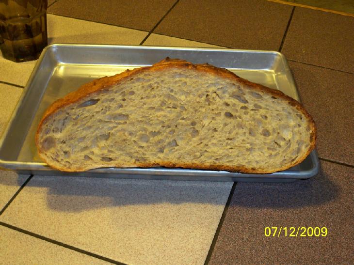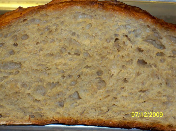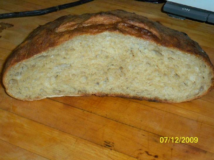 The crust  was a little hard, so I just basted it with some soft butter.  I knew the kids would be after it, so I didn't let it just sit and cool like I should have.  because of that, I can't give you an accurate crust report nor can I give you a good crumb report.  When the kids aren't here, I allow it time to cool.  This got devoured warm.