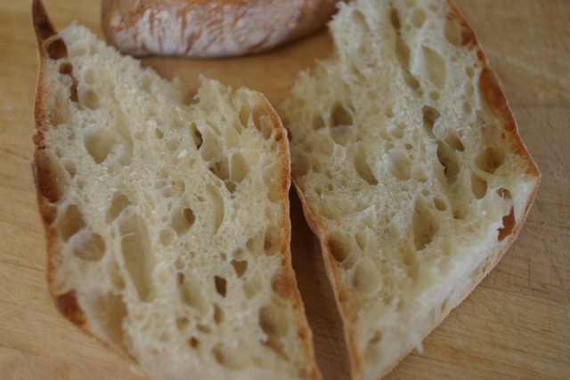 I cut the baguette horizontally for a sandwich. I was very happy with the large holes in the crumb.